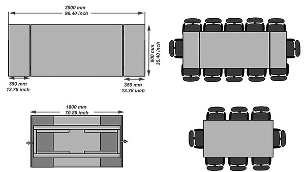 Product Size: | 1800mmW (2500mm when extended ) x 900mmD x 760mmH (with 2* 350 mm lateral extension leaf) |